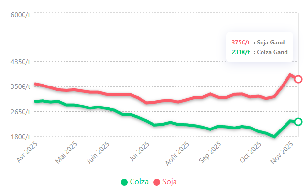 Tendance : Le marché est moins exposé à un effondrement brutal que le soja, grâce au soutien du complexe des huiles et à sa position en protéine européenne. La stabilité du prix de l'huile de colza Brest indique une solide demande industrielle.