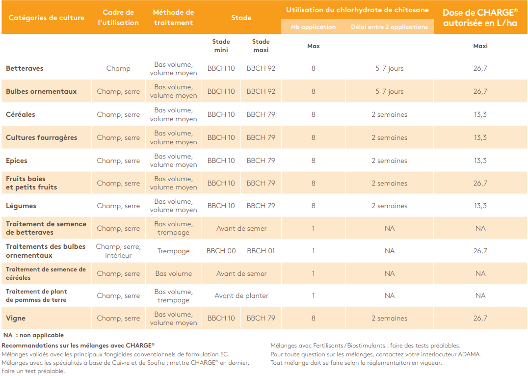 Charge® peut être pleinement intégré dans une entreprise durable et biologique, offrant des efficacités fongicides sur un large éventail de cultures telles que céréales, betteraves, pommes de terre et vigne. Les expérimentations d'ADAMA mettent en évidence des bénéfices significatifs, notamment sur la septoriose, fusariose, cercosporiose, rhizoctone brun, mildiou et oïdium, entraînant des gains de rendement.
