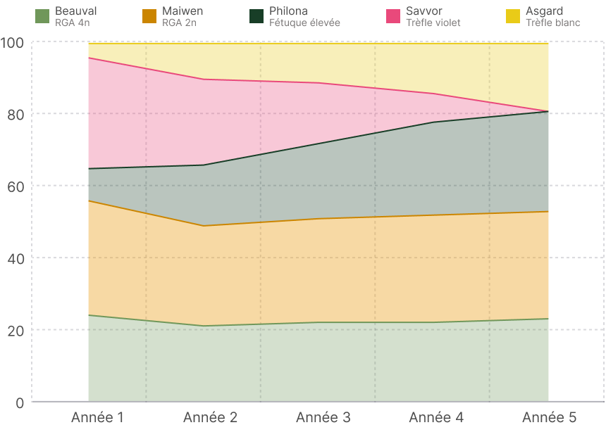 *Les variétés mentionnées sont celles utilisées de base dans le mélange. En cas de rupture, des variétés équivalentes peuvent être utilisées pour la fabrication du mélange. Ces modifications ne remettent en aucun cas en cause les performances agronomiques et de productivité du mélange