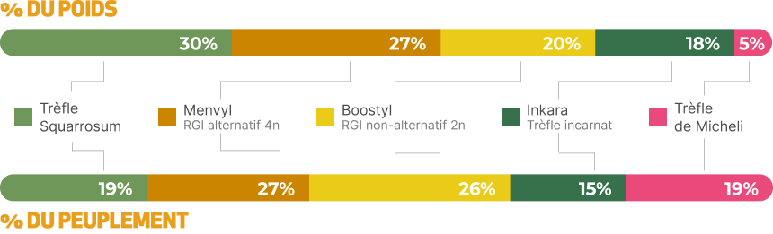 *Les variétés mentionnées sont celles utilisées de base dans le mélange. En cas de rupture, des variétés équivalentes peuvent être utilisées pour la fabrication du mélange. Ces modifications ne remettent en aucun cas en cause les performances agronomiques et de productivité du mélange